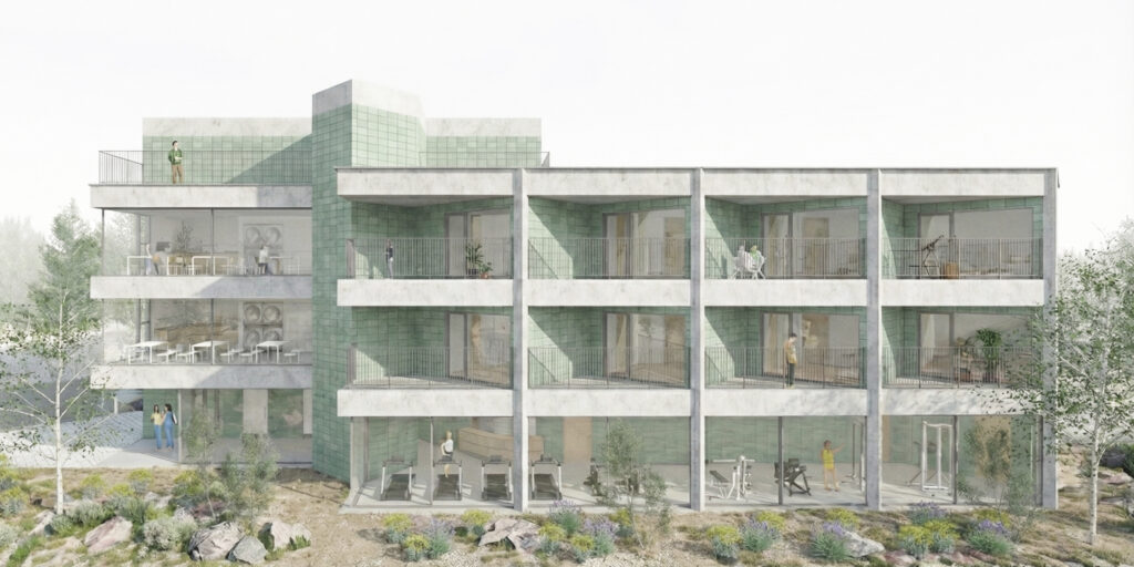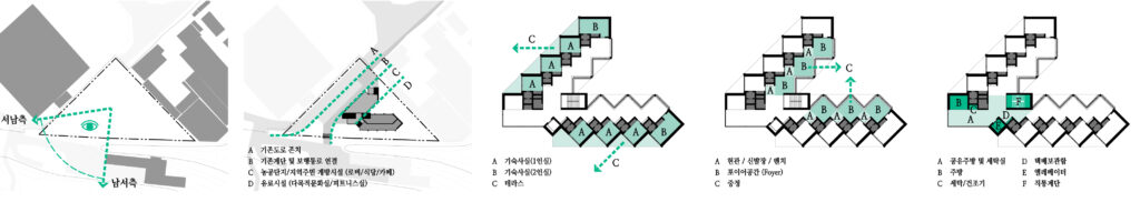 The site is a triangular lot tucked away at the very edge of the industrial complex. It’s a tough environment—surrounded by the constant noise of factories on either side and a deserted building to the south. Yet, there is a hidden gem: a beautiful forest to the south. Although the field of vision is narrow, the forest and the neighboring village are visible through the gap between the southwest and south-southwest. I focused on capturing this specific view to ensure every room has a proper orientation. By rotating the axis of the units 45 degrees from the adjacent buildings, I was able to carve out a buffer space between the rooms and the neighbors, mitigating the site’s disadvantages.