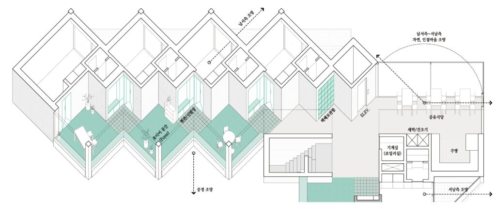 ocated in the Gunbuk industrial complex of Ham-an, this dormitory serves as a cozy home for about 30 young workers. The layout is modestly scaled, offering 12 single units and 4 double units. Based on the competition guidelines, each single room is roughly 20㎡—a compact space that includes both a bathroom and shower. Given these spatial constraints, I was concerned that residents might feel cramped. To solve this, I decided to introduce the ‘foyer’ concept, creating a transitional breathing room that breaks the boundary between the private quarters and the outside world.