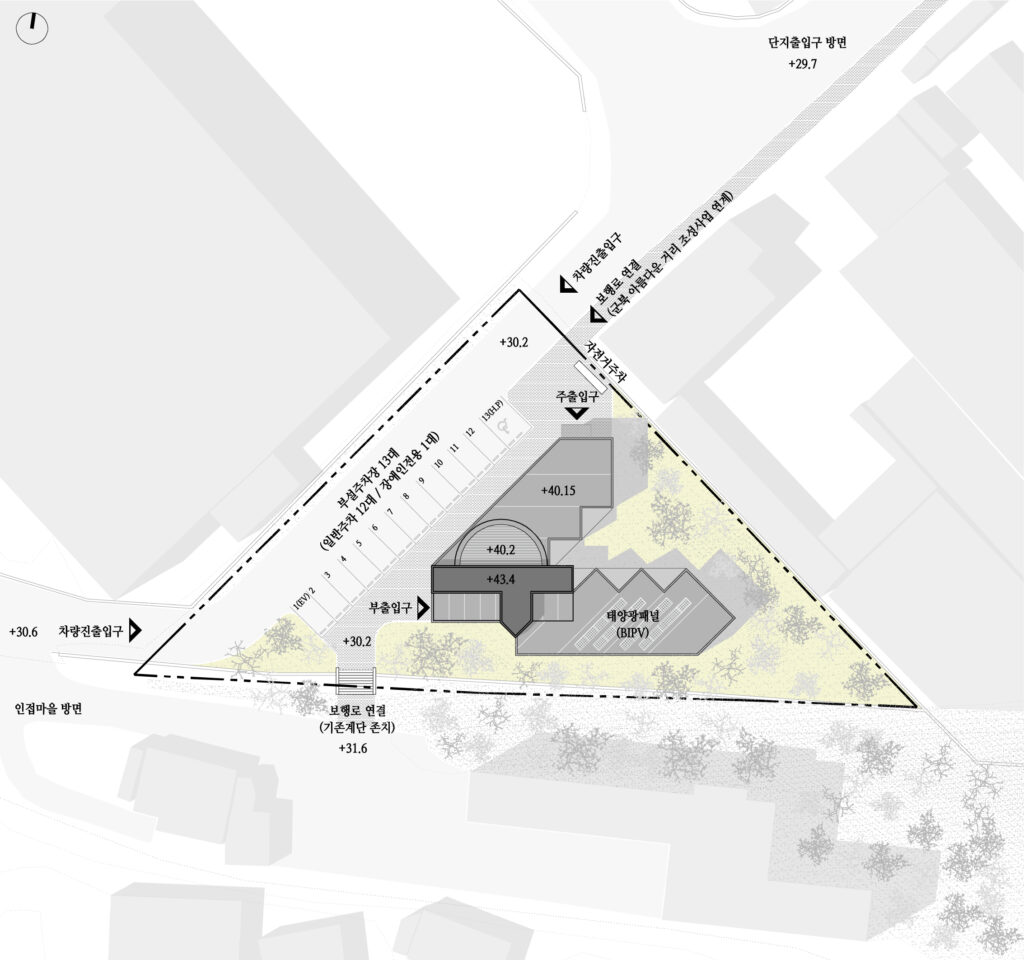 이 좁은 틈으로 어떻게든 모든 실들의 향을 확보하였습니다. 그리고 실들의 축을 인접건물과 45도 비켜 배치하고, 방과 인접 건물 사이에 완충공간을 두었습니다.
