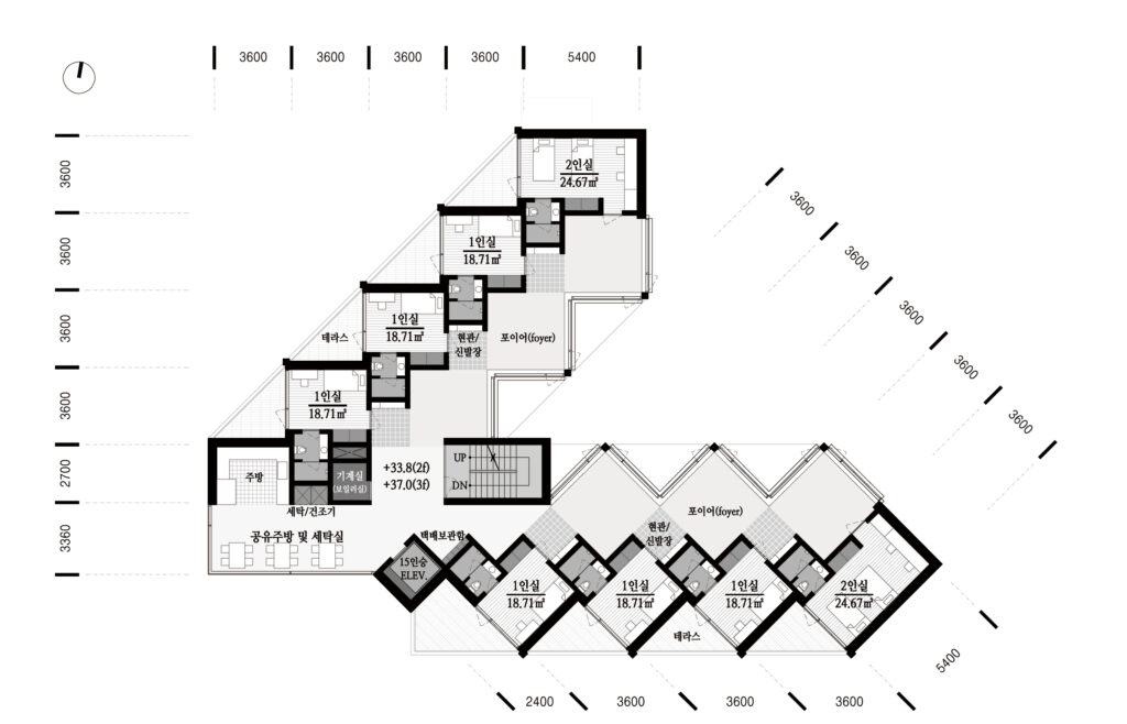 최대인원은 약 30명 정도, 1인실 12개, 2인실 4개로 구성되어있는 아담한 구조인데, 공모 요강에서 1인실은 약 6평(화장실포함..), 2인실은 약 7평 정도를 요구합니다.