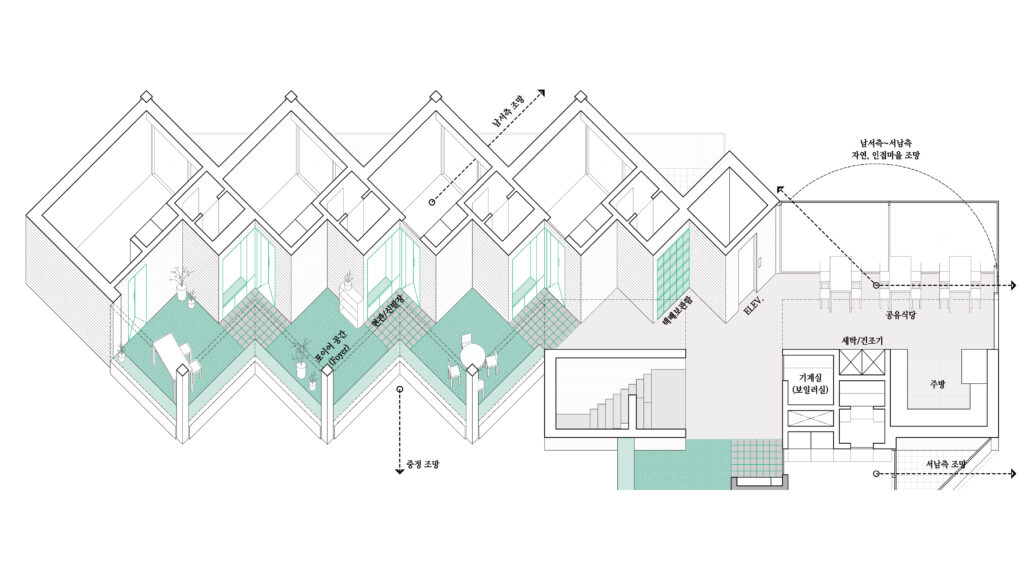 현관을 실 외부로 확장해 신발장과 벤치, 수납이 어우러진 작은 니치(niche) 공간을 형성하고, 그 앞의 포이어는 거주자가 각자의 취향에 맞게 꾸밀 수 있는 여백으로 계획하였습니다. 현관과 포이어가 결합된 구조는 단조로운 복도를 거주자 간의 교류가 일어나는 장으로 바꾸며, 공간에 깊이와 다양성을 부여합니다. 일반적인 기숙사에서는 복도와 방이 단순히 벽 하나로 구분되지만, 이 프로젝트에서는 공유시설–포이어–현관/신발장–방으로 이어지는 자연스러운 Public에서 Private으로의 흐름을 만들어냅니다.
